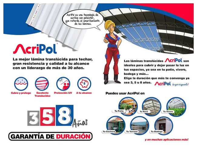 GALERÍALa estructura y elaboración de este producto se compone de un laminado plástico de acrílico - poliéster reforzado con fibra de vidrio, que cumple con la relación 70 % de resina y 30 % de fibra de vidrio; un material de alta duración y calidad,